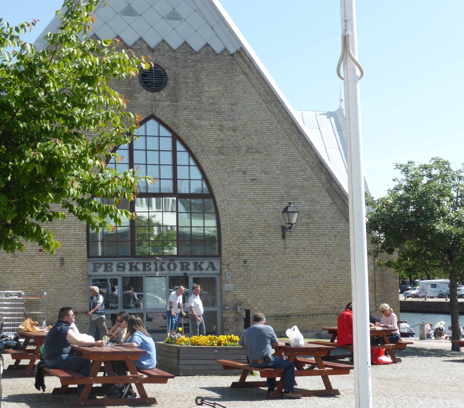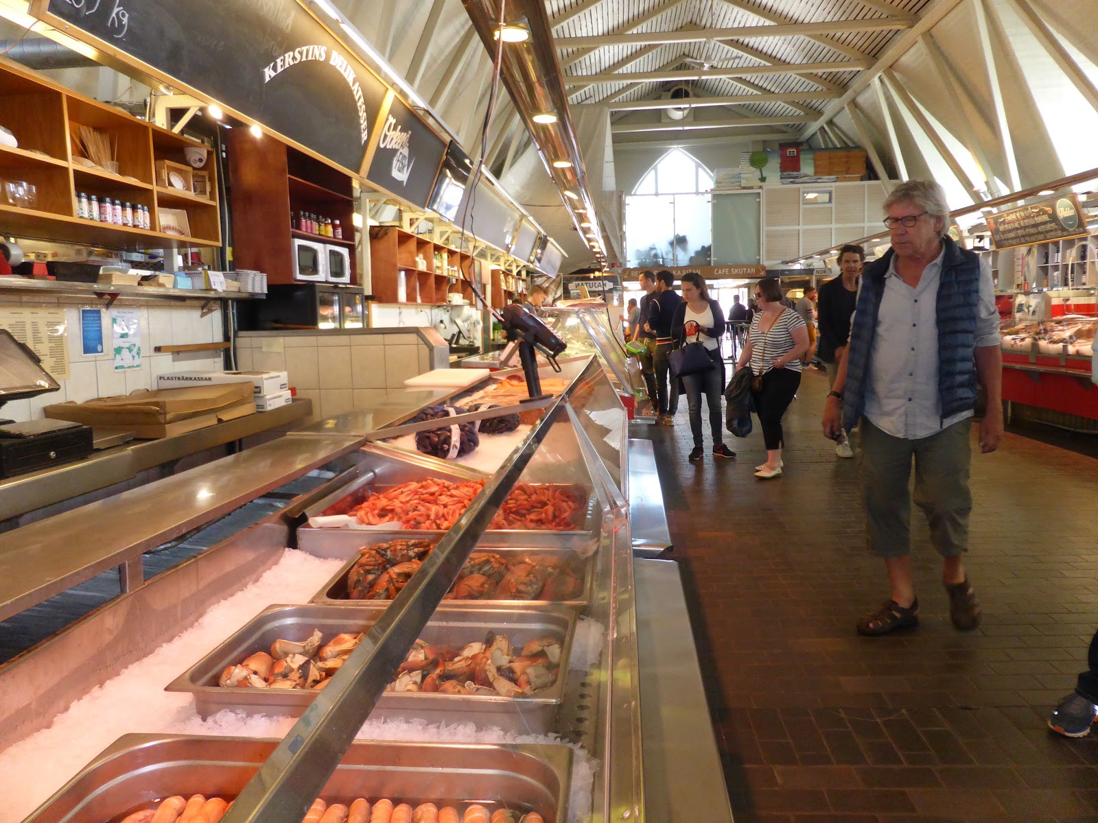 Passage par Feskekörka, un marché couvert aux poissons et déjeuner d’une salade crabe-crevettes sur la terrasse.