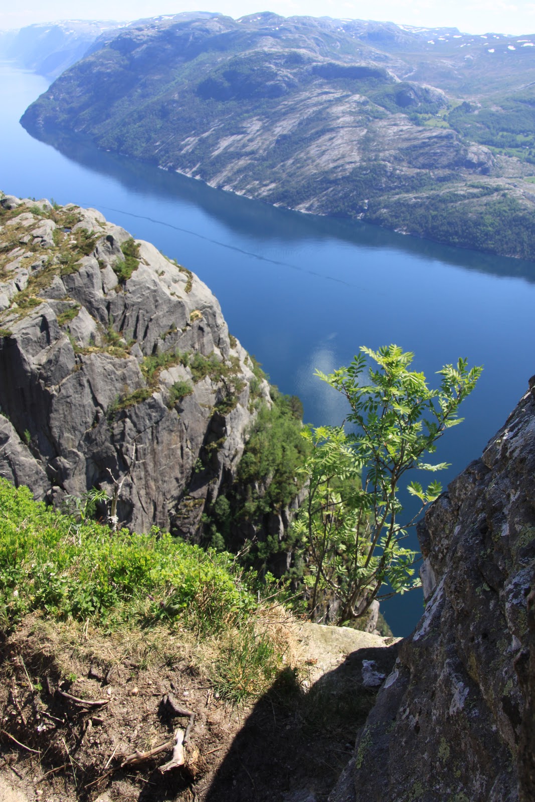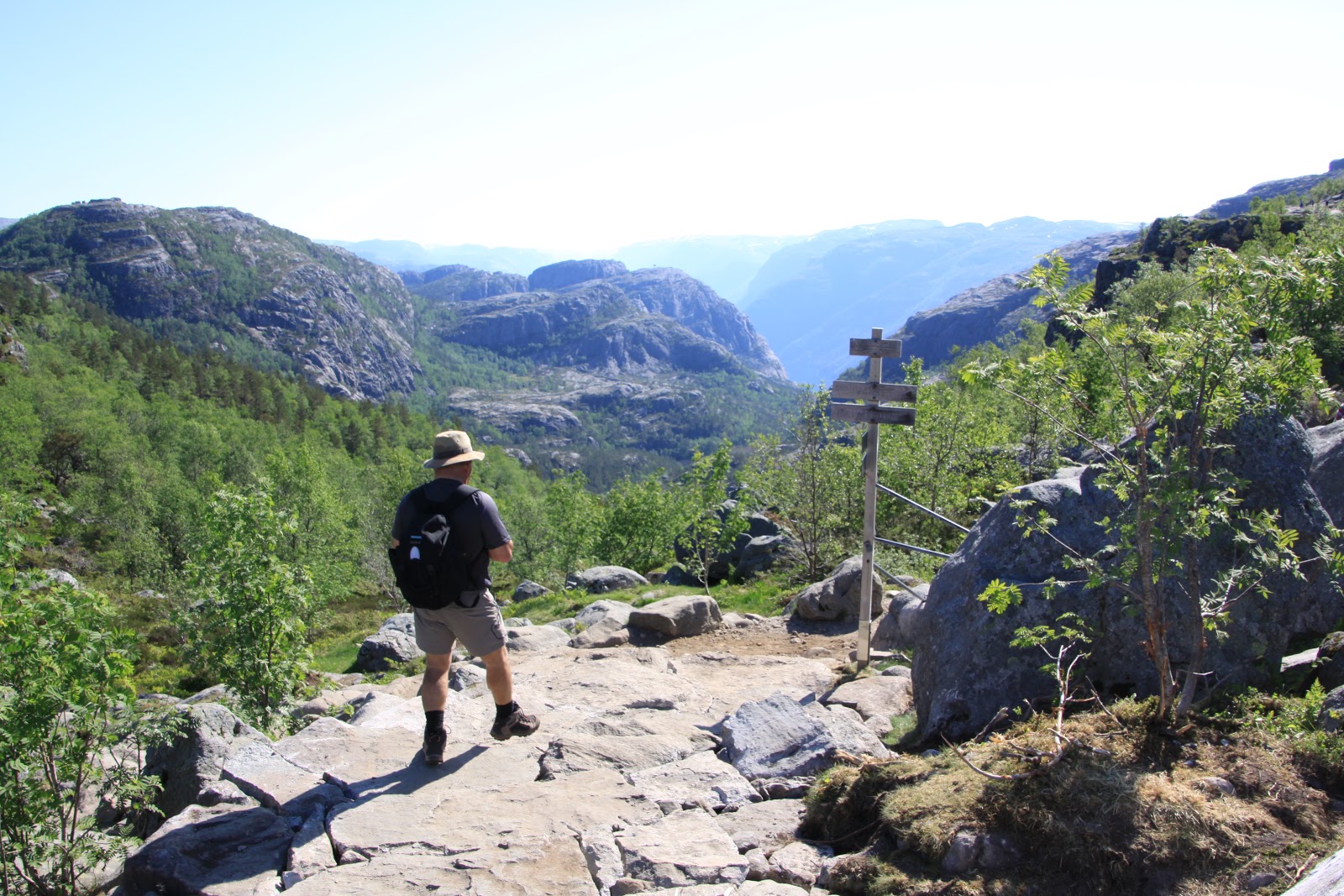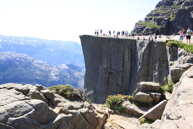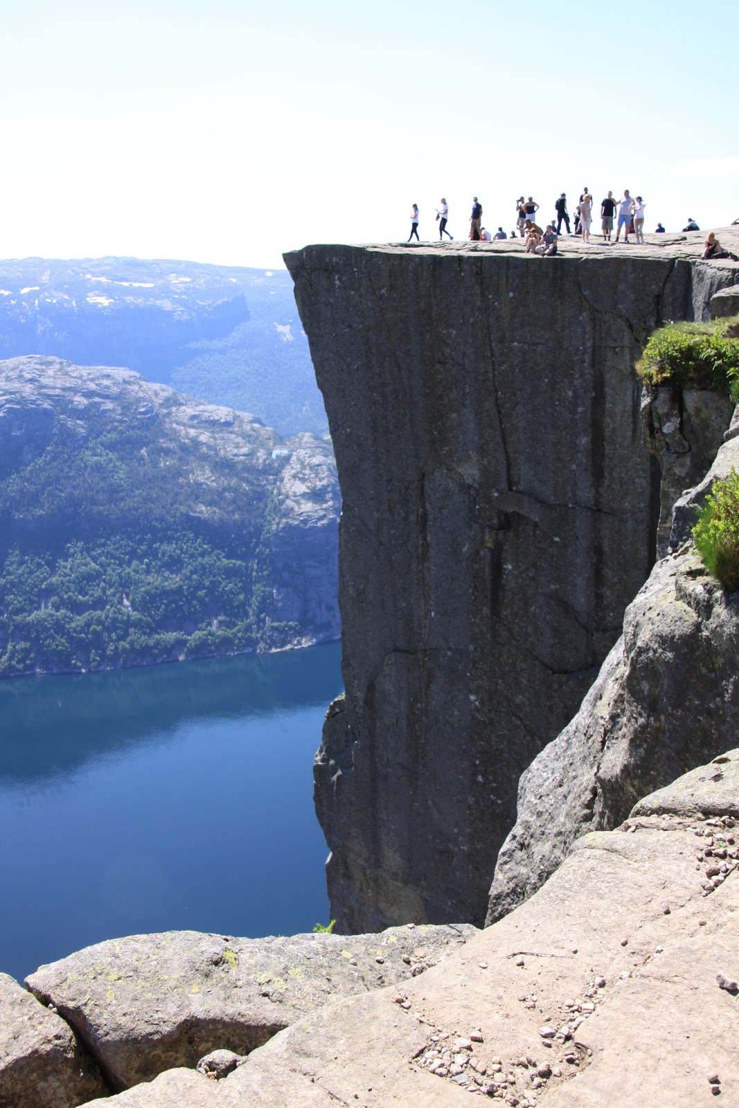 Preikestolen c’est un gros rocher monolithe de 604 m de haut qui surplombe les eaux du Lysefjord, face Ă  la ville de Stavanger. On fait l’impasse sur la ville, car on prĂ©fĂšre gambader dans la nature. Et on a Ă©tĂ© servis !