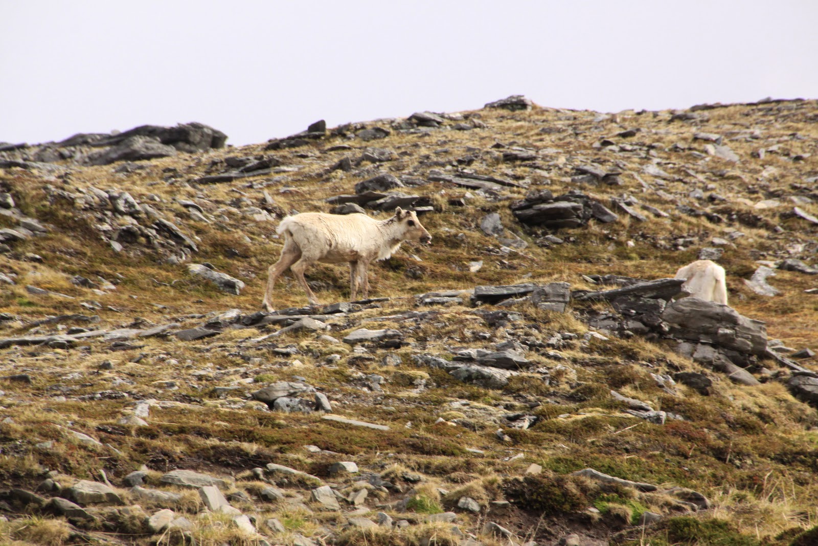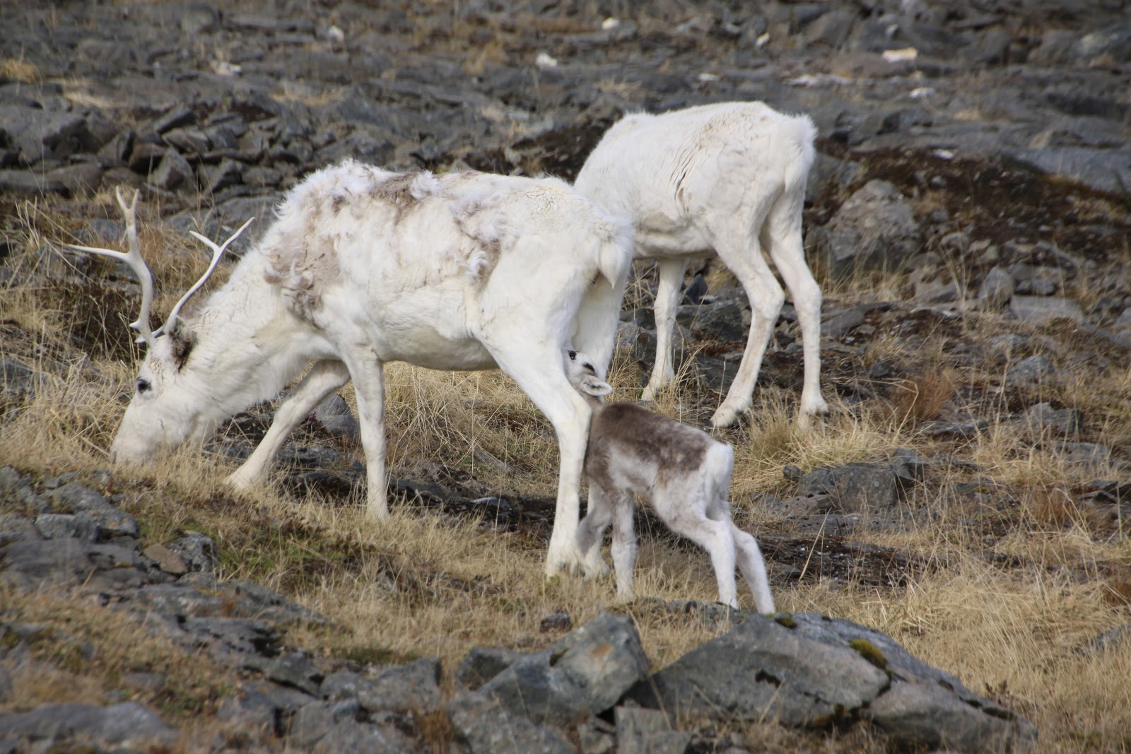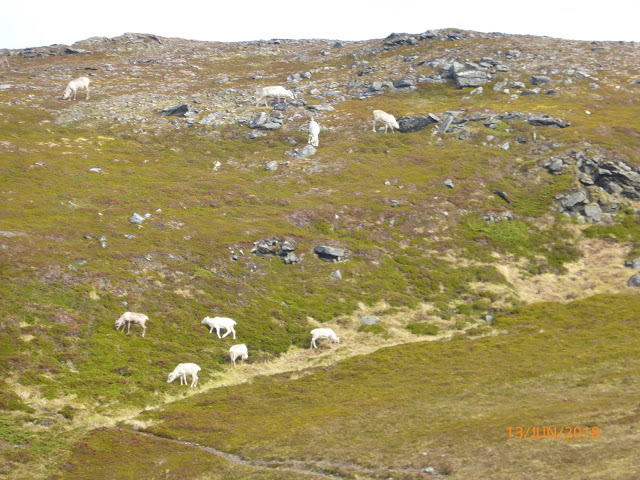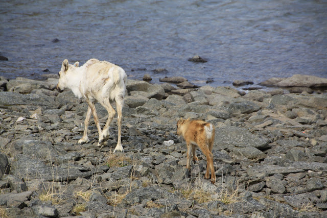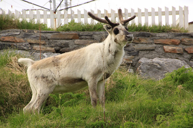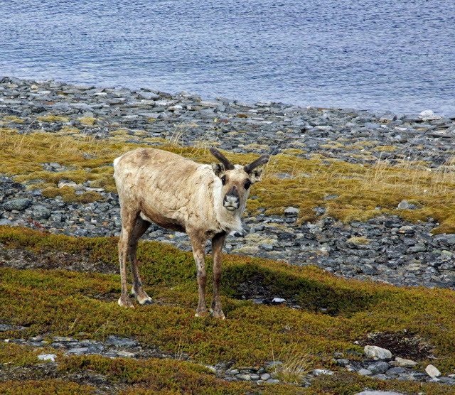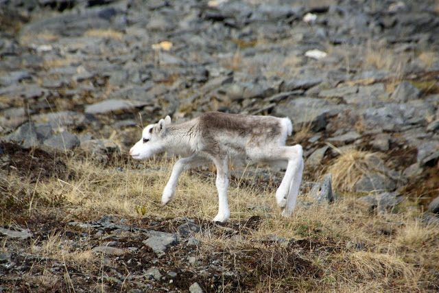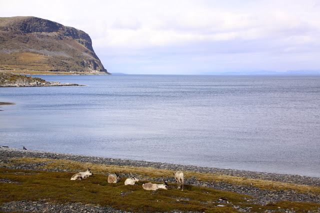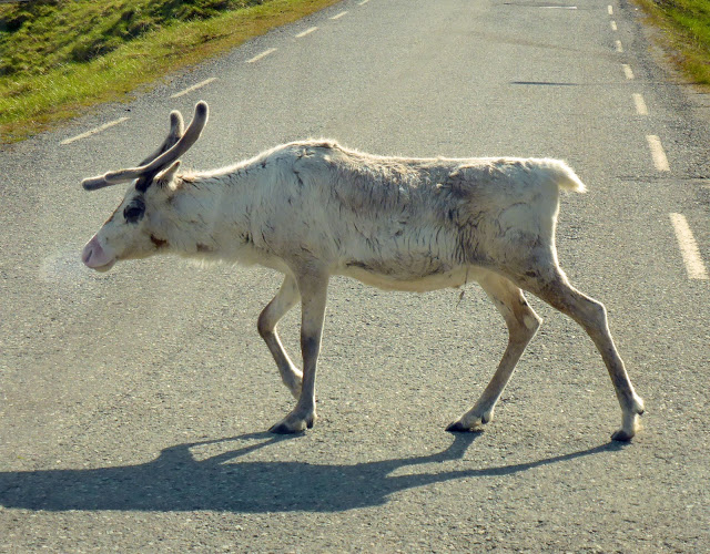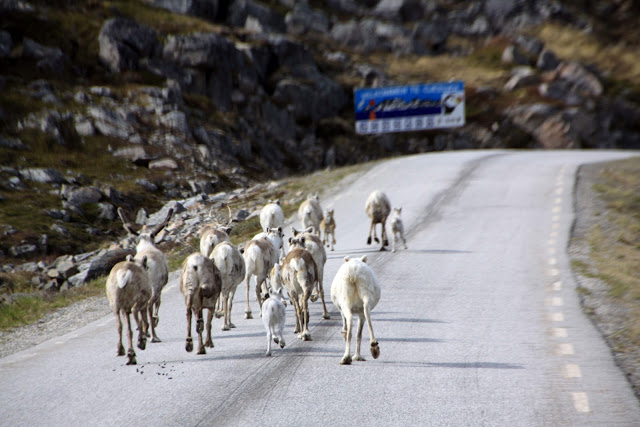 C’est tout à fait au nord de la Norvège dans la région du Finmark que nous avons croisé des troupeaux de rennes, ou des couples de rennes, avec ou sans petits, et des rennes isolés. La région étant difficilement cultivable, ils occupent tous les espaces : toundra des hauts plateaux encore partiellement enneigés, bords de mer, villages, routes…