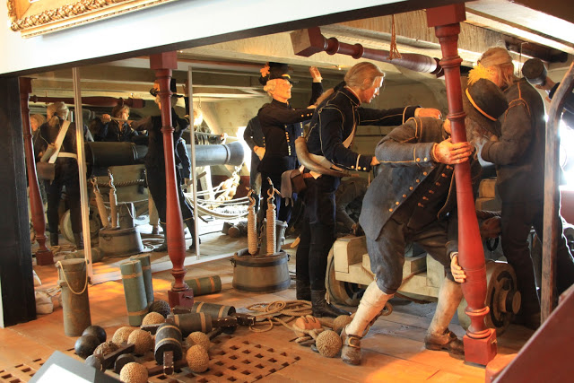 … et proposent une reconstitution visuelle et sonore d’un pont à canons en activité, où on réalise bien l’espace très réduit dans lequel devaient évoluer les nombreux soldats nécessaires pour actionner les canons (mais qu’allaient-ils donc faire dans cette galère ?…).