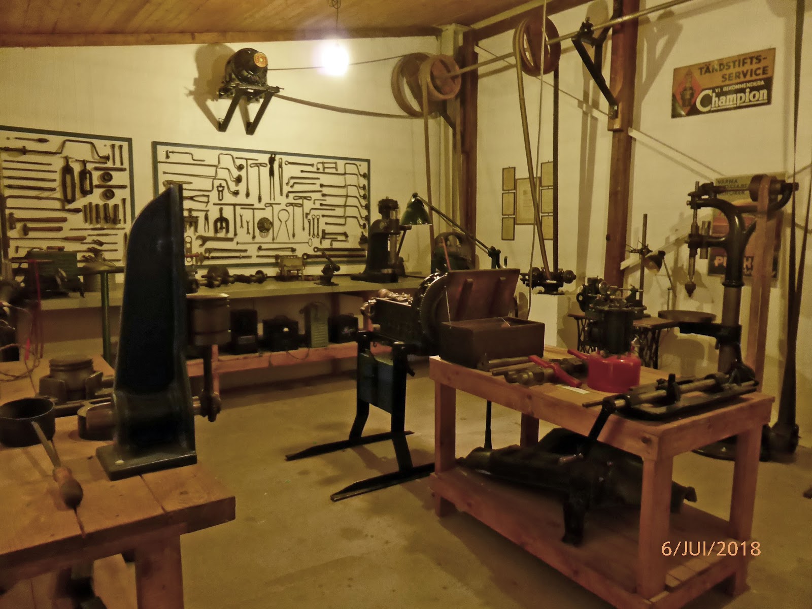 InĂ©vitablement, on entre au garage, Ă©quipĂ© dâun systĂšme de courroies (courant dans tous les ateliers d’autrefois me souffle mon expert…) pour entraĂźner les moteurs des machines.