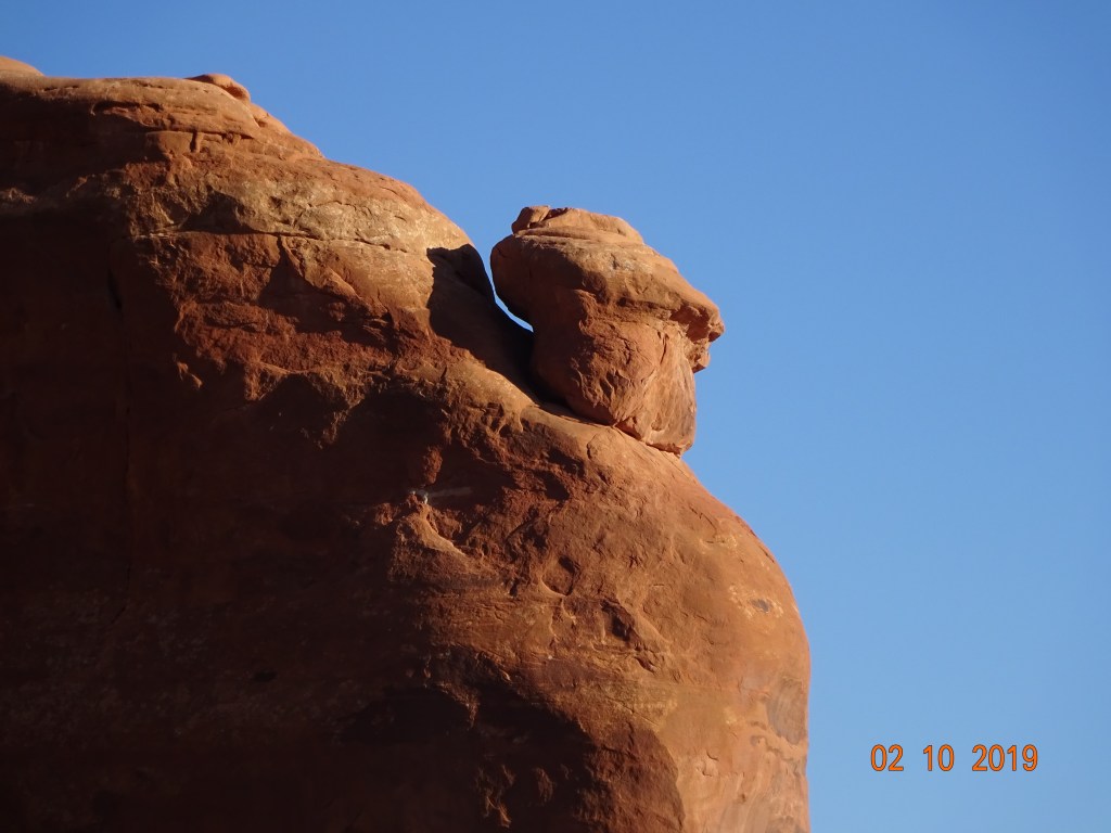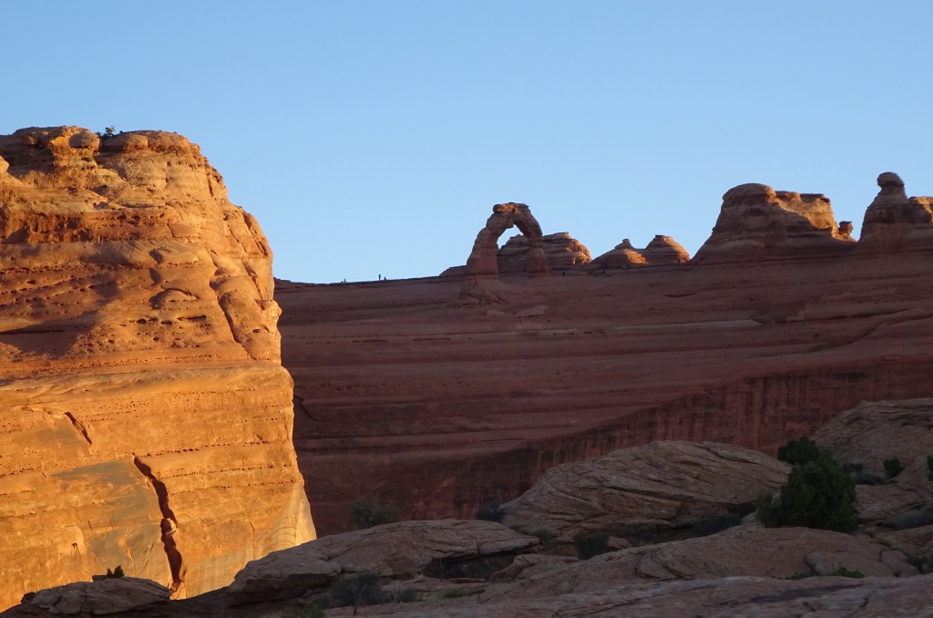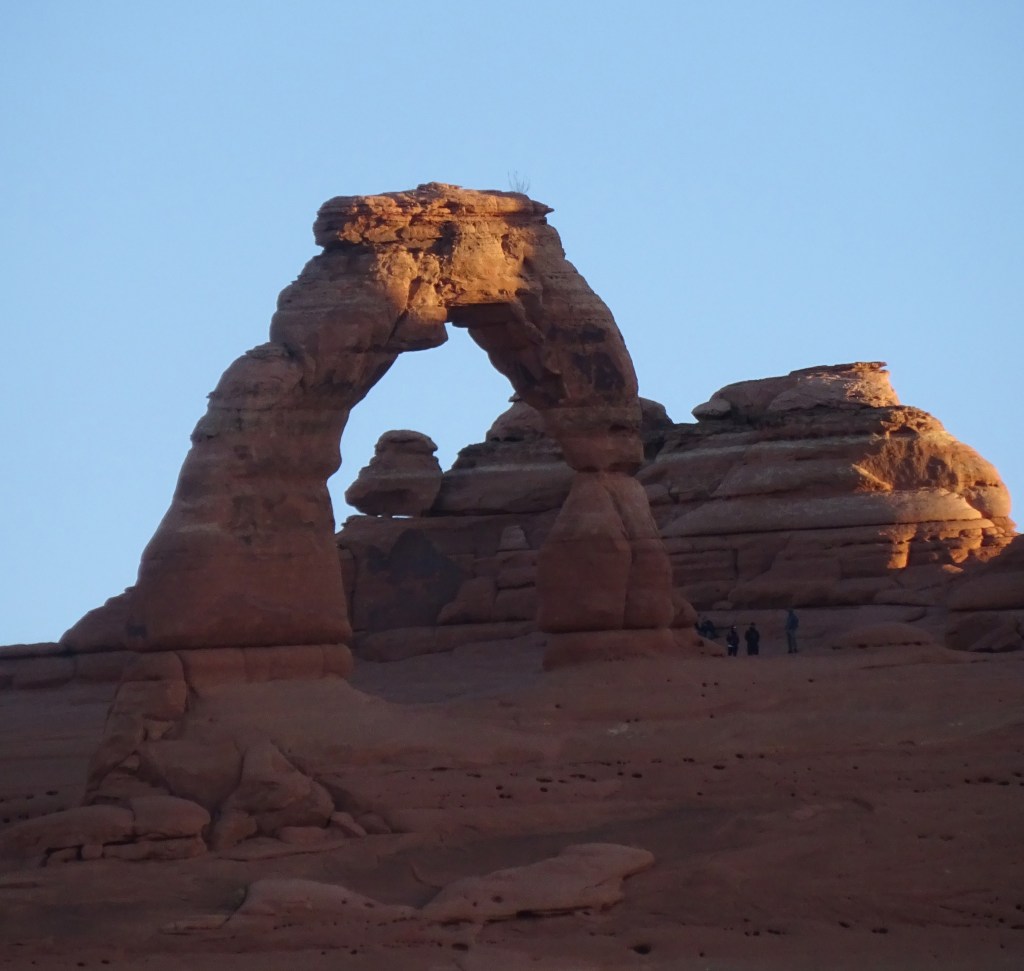 Petit-déjeuner avec les ouvriers BTP du coin, entrée de nuit dans le parc, petite rando-grimpette caillouteuse d’un quart d’heure, et à 7h04 pétantes nous voilà perchés en haut d’une butte pour voir le soleil se lever sur l’une des 2 arches les plus visitées du parc : Delicate Arch.