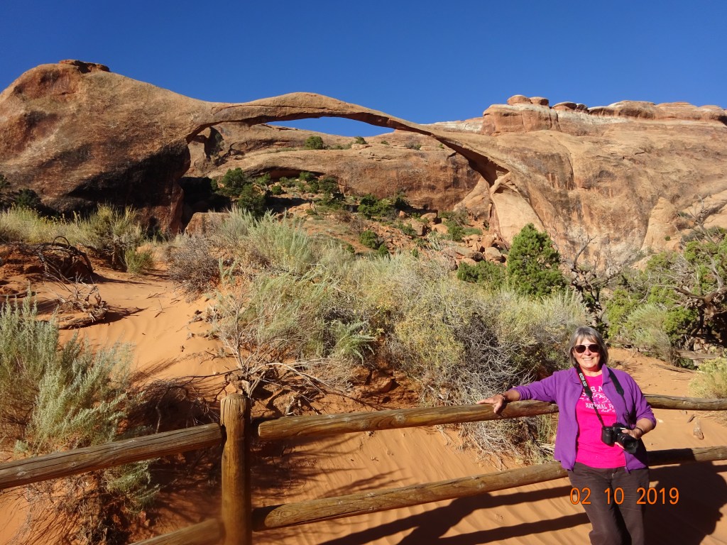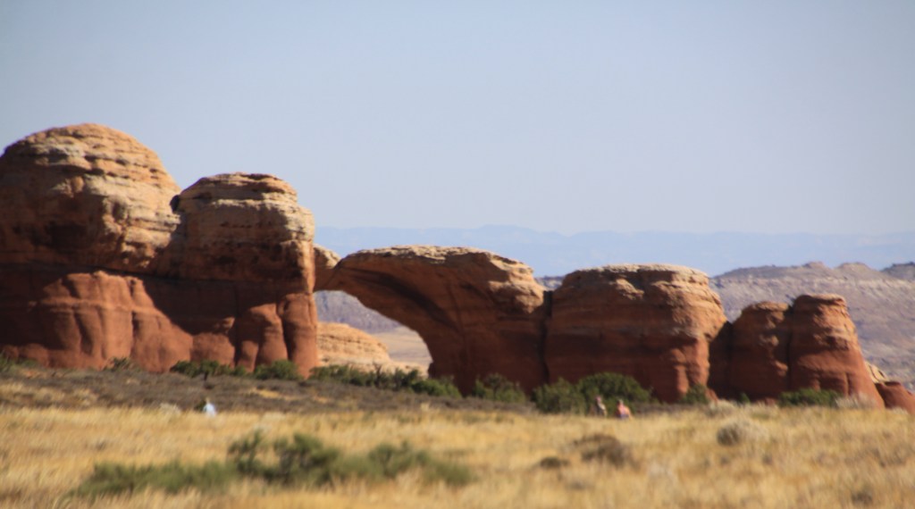 Comme on n’a pas choisi l’accès par la rando de 5 km qui monte qui monte, mais – tout se mérite – qui arrive juste en-dessous de l’arche, un canyon nous en sépare. D’où probablement une petite déception de la voir d’un peu loin et pas vraiment de face, ce qui nous prive de pouvoir apprécier pleinement sa « délicatesse » : le rétrécissement de l’un de ses piliers.