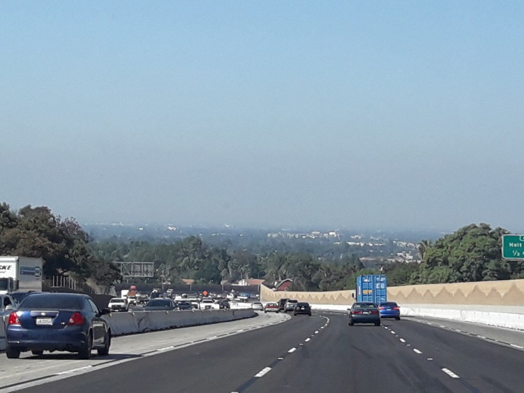 Une bonne centaine de km avant d’arriver sur Los Angeles, déjà on prend peur : il flotte comme un nuage horizontal marronnasse à l’horizon…
