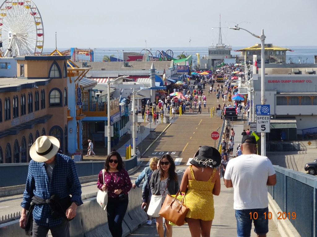 Le lendemain matin, nous sommes allés à Santa Monica, voir la “Pier”, le terminus de la route 66, une jetée en bois qui s’avance dans la mer, avec ses attractions, sa grande roue, et la grande plage qu’elle enjambe.