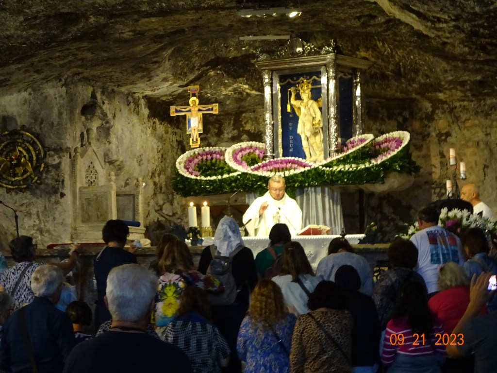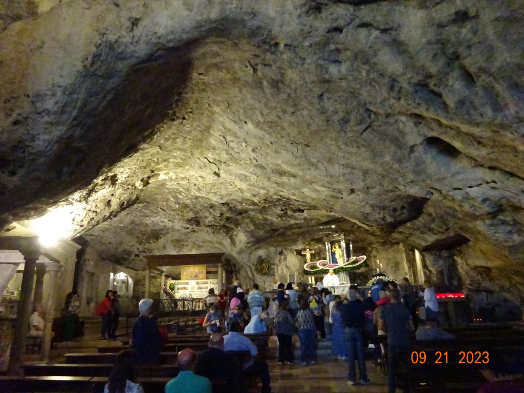 On arrive enfin à la grotte, qui est une sorte de caverne avec sa voûte en pierre naturelle. Au moment de notre arrivée, une messe était en cours, par un prêtre qui semblait réciter les paroles à toute vitesse (mais l’Italien parle, parle, parle vite… sans vouloir stigmatiser bien sûr !). Et plein de personnes étaient agglutinées autour de l’autel sur le mode Plus près de toi mon Dieu.