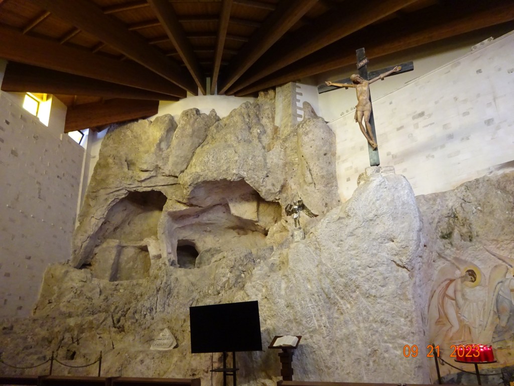 Allez, debout, j’en vois qui dorment, et en route pour la grotte divine, ou celeste basilica de son petit nom. Plusieurs niveaux avant d’arriver au Sanctuaire de l’Archange Saint-Michel.