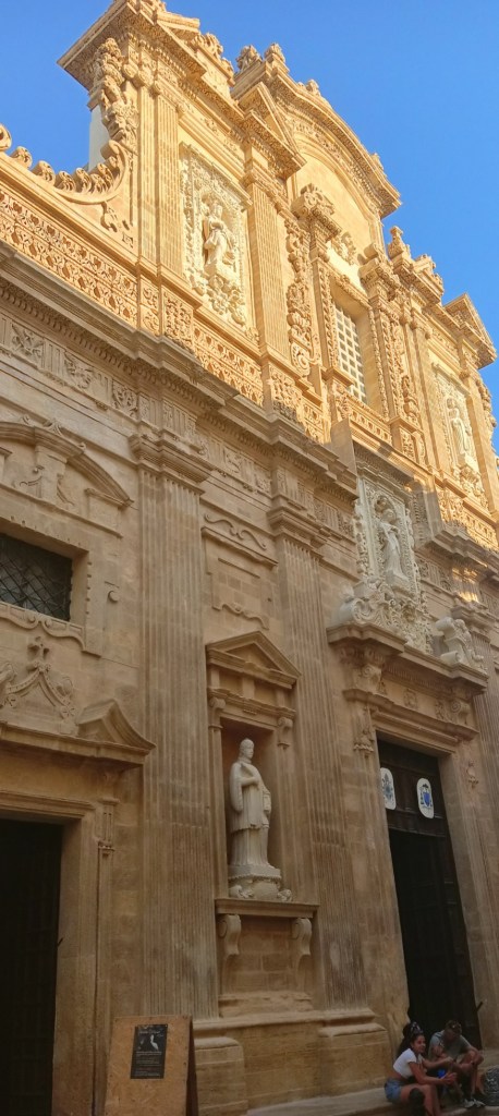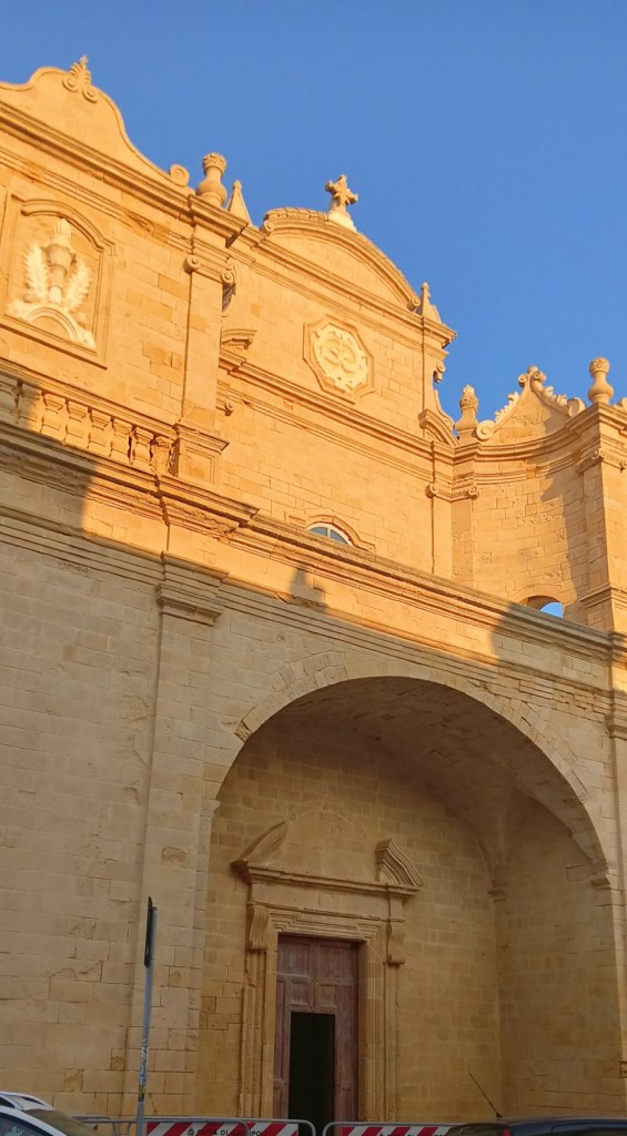 La cathédrale di Sant’Agata s’impose très vite, superbe dans sa belle couleur dorée due à une pierre locale très friable appelée carparo. Elle est implantée dans une petite rue, ce qui limite fortement la vue d’ensemble :