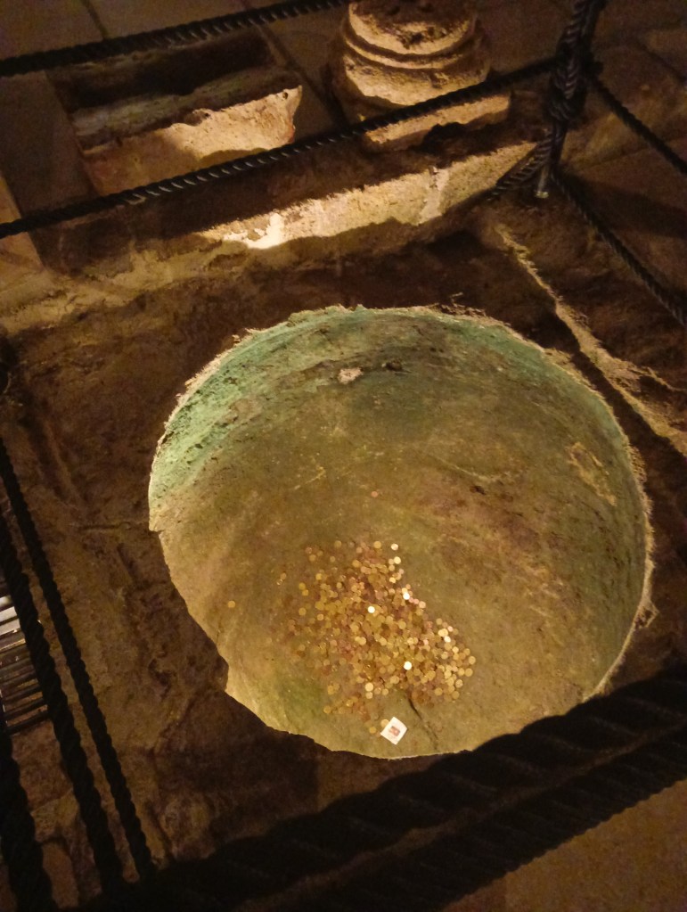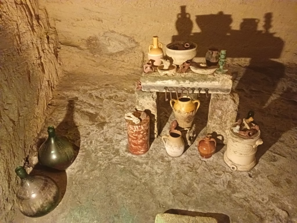 c’est un ancien moulin hypogé (souterrain), où était fabriquée l’huile servant pour les lampes. Ils étaient 35 comme celui-ci sur l’île de Gallipoli, un vrai gruyère, tous creusés en sous-sol en raison de la température toujours constante entre 18° et 20°, condition idéale pour faciliter le pressage de l’huile.