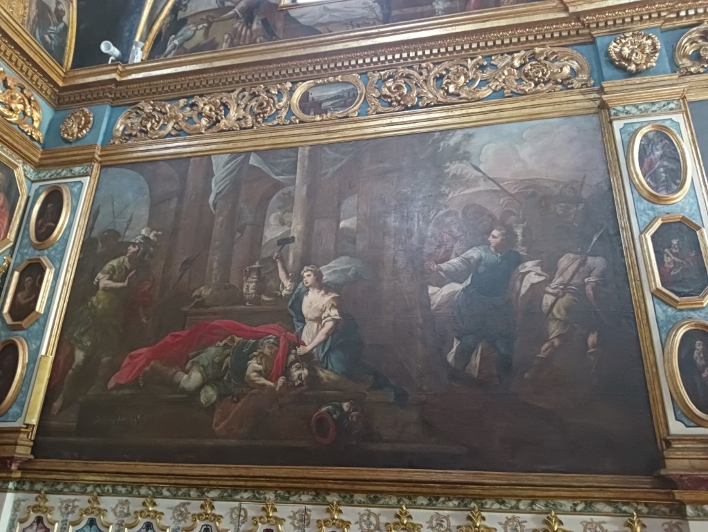 L’intérieur a de vastes dimensions, tout comme les immenses peintures aux tons sombres qui recouvrent murs et plafonds presque intégralement. L’effet est assez saisissant.