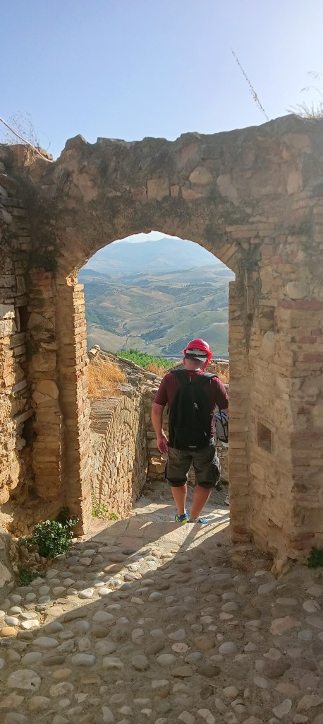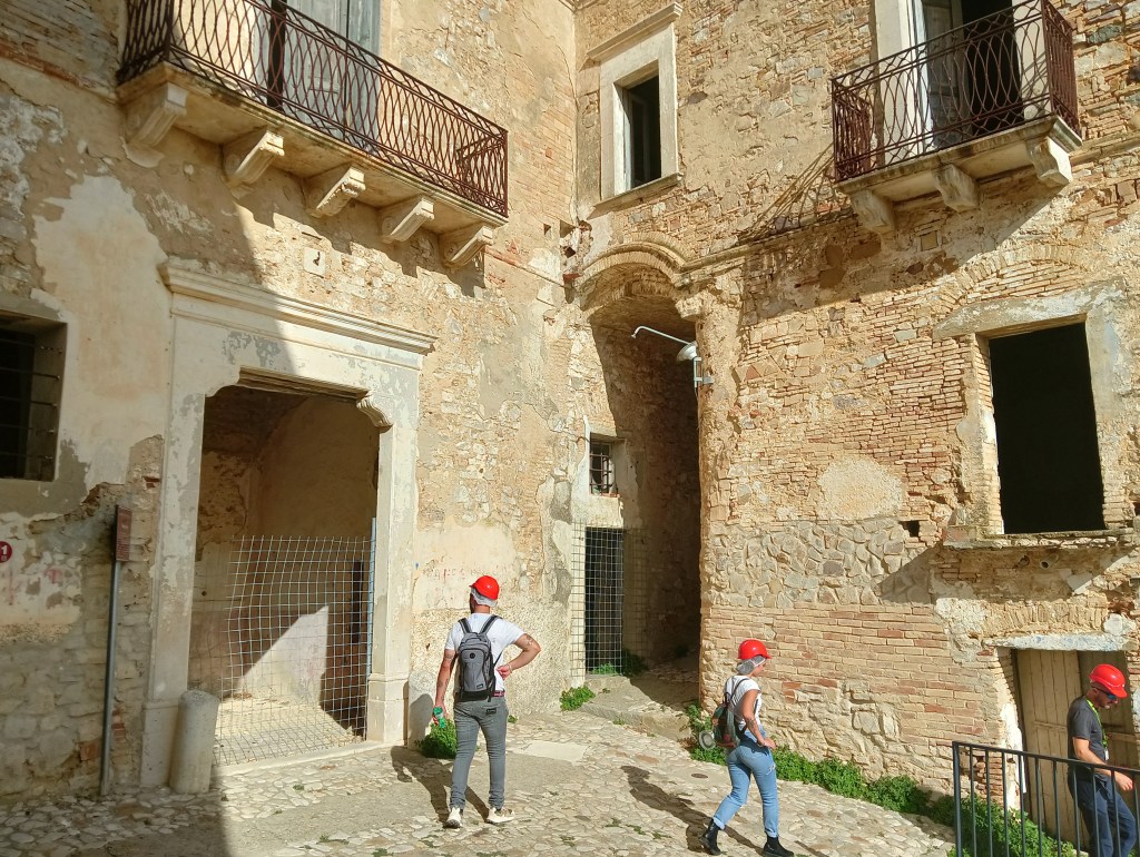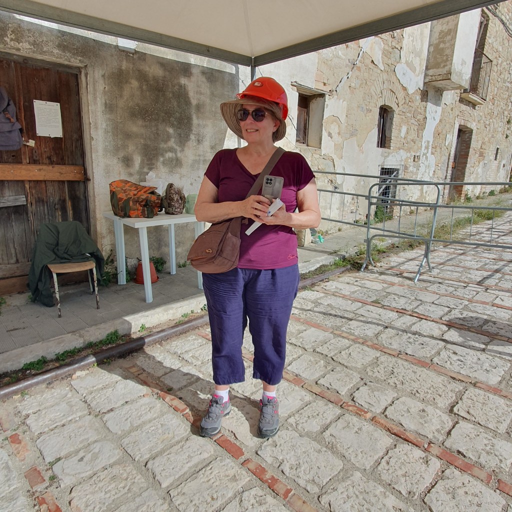 Le village est inscrit depuis 2010 sur la liste des lieux à préserver par le World Monument Fund. Les visites ne sont autorisées qu’accompagnées par un guide. Le nôtre ne parle qu’italien, mais comme nous ne sommes que 4 à nous présenter à la visite de 15h, il a été adorable et a déployé d’énormes efforts pour nous faire un résumé des explications avec quelques mots d’anglais ou de français, complétés d’un dictionnaire en ligne. Et il a fallu s’équiper…