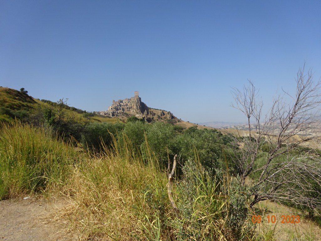 Et surgissant au loin, le village de Craco, perché au sommet d’une colline rocheuse.