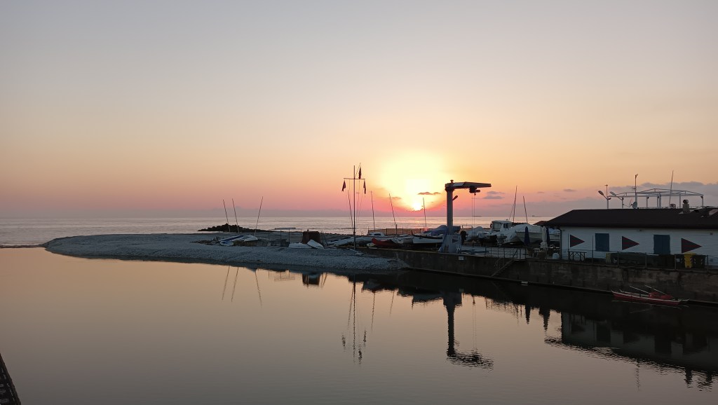 Première halte nocturne au sud de La Spezia et des Cinque Terre, en bord de mer, sur un grand parking tranquille et presque désert. Et on file se dégourdir les jambes sur le front de mer pour profiter du splendide soleil couchant.