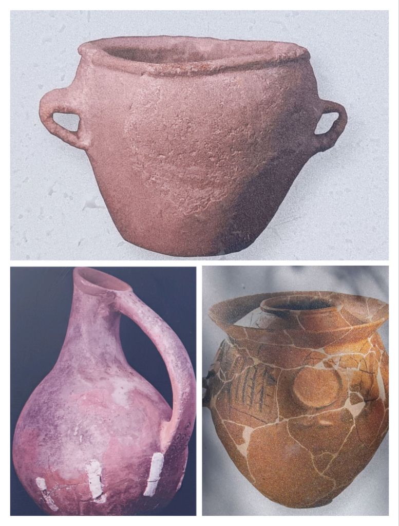 En haut : outre d’offrandes – en bas à gauche : cruche à vin – en bas à droite : vase rituel décoré
