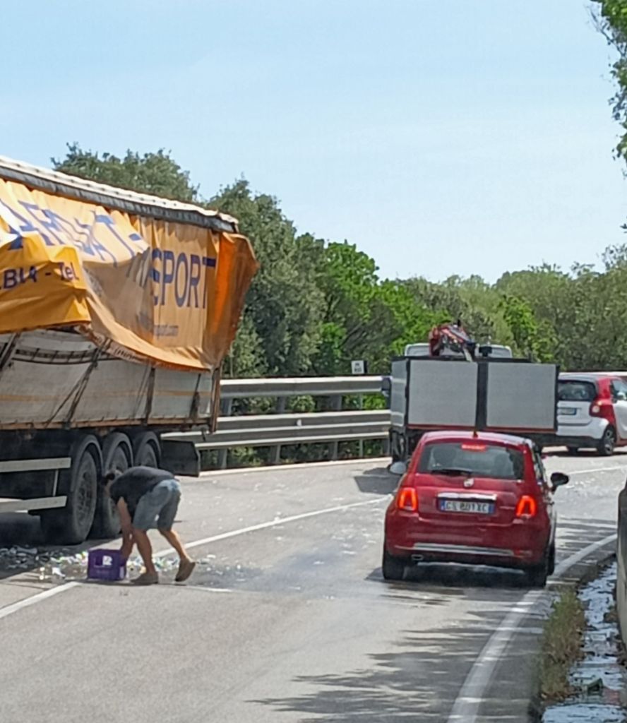 Je plains le chauffeur… Et l’ex pro du dépannage à mes côtés ne peut pas résister : « Je vais pas le laisser comme ça… » et ni une ni deux il se gare sur le côté, enfile ses gants de cuir et descend lui donner un coup de main pour dégager le verre avec les moyens du bord, les cagettes.