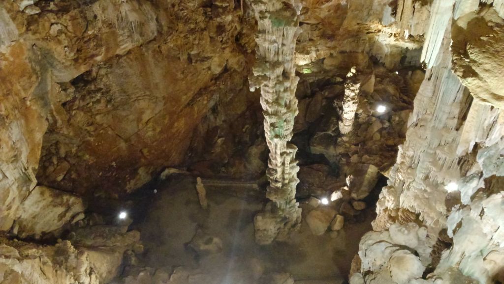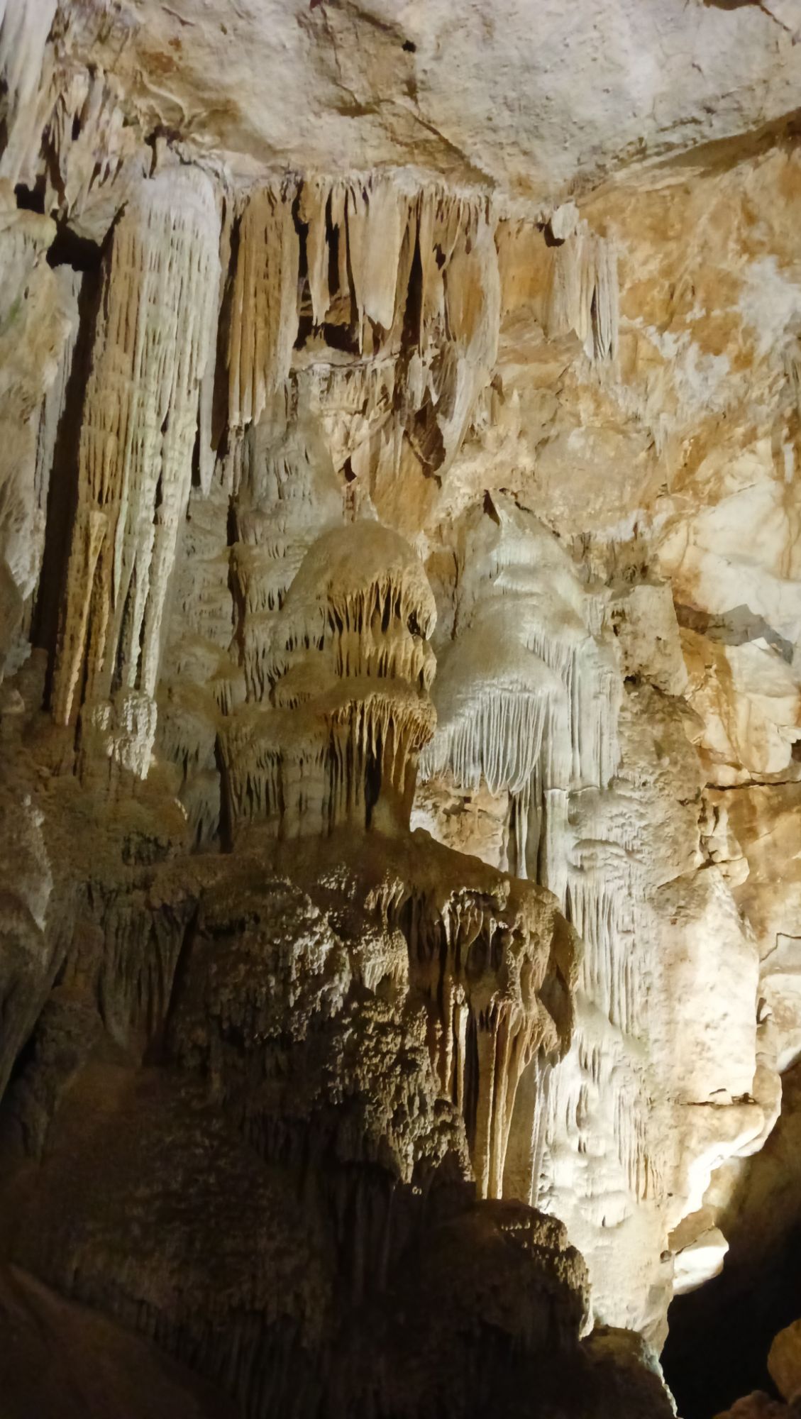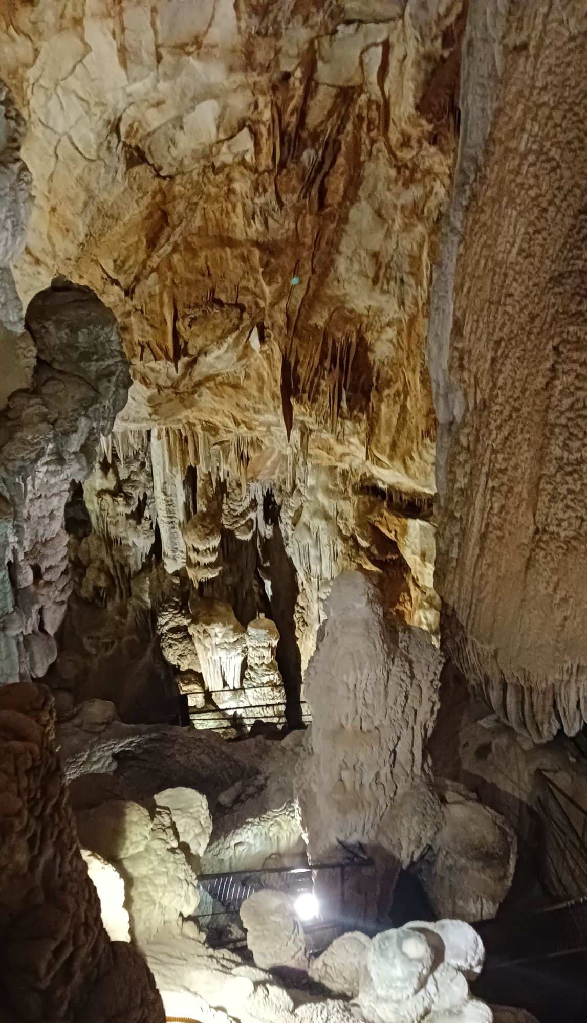 On y accède par un escalier de plusieurs dizaines de marches, et à l’intérieur, on redescend 280 marches pour nous retrouver au fond d’une immense chambre de 60 m de profondeur, 17° toute l’année, magnifique et impressionnante.