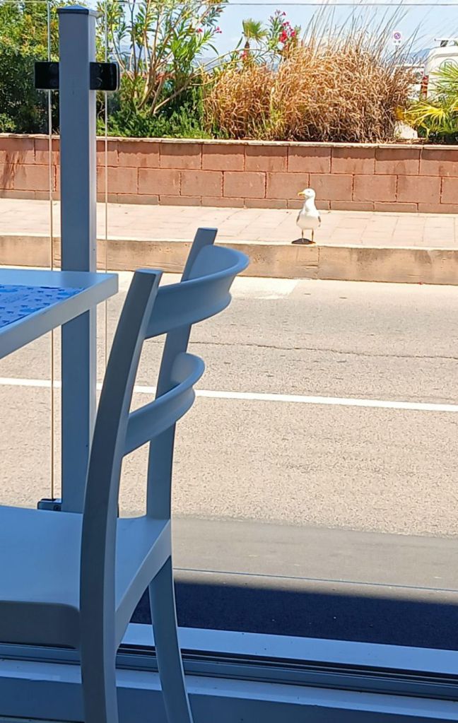 Une mouette ne quitte pas la devanture du resto, malgré les voitures qui passent, quémandant quelques miettes de poisson qu’elle n’obtiendra pas (on donne déjà pas à notre chatte)…