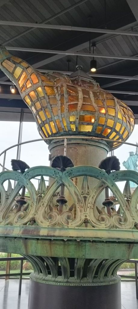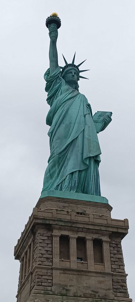 Quelques précisions d’importance puisqu’elle concerne la France 😊 : l’enveloppe extérieure est faite d’un assemblage de plus de 300 fines couches de cuivre, chacune de l’épaisseur de 2 petites pièces de monnaie, coulées dans des moules en bois. C’est l’oeuvre du sculpteur français du 19ème Bartholdi, et la structure de support en fer a été conçue par Eiffel. Que du beau monde !