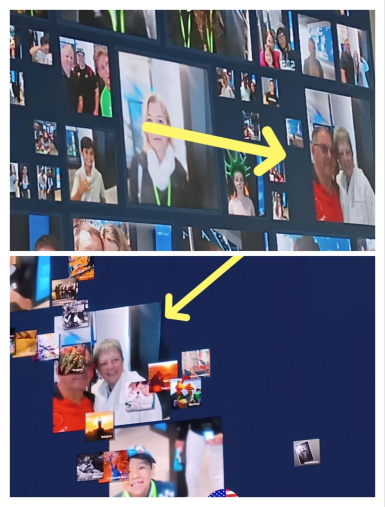 Et une animation distrayante à la gloire des visiteurs : plusieurs écrans proposent de cliquer sur un choix de photos symboliques – éducation, égalité, citoyenneté, etc, d’y rattacher une photo de soi, qui part sur un immense mur animé où les photos défilent pour aller se fondre sur une silhouette de la statue composée de toutes les photos.